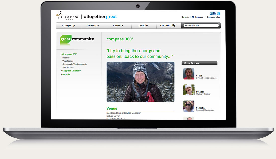 A requirement for the Altogether Great website is that it had to use the Compass Groups’ existing SharePoint platform so that different departments within the organization could manage their respective sections/pages. SUMMUS was hired to development a custom theme based on Photoshop designs, which needed to be implemented with the SharePoint platform.