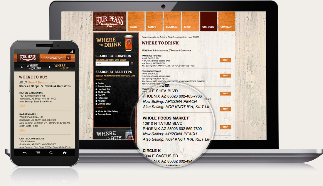 Four Peaks was in need of a website that showcased their amazing award-winning brews. They also wanted to offer the public ways to easily located their beers at stores or pubs across the US. With community at the forefront of their mission, it was important to have an events calendar, blog, photo gallery and social-based functionality. The company also offers many products to their loyal fans and needed to provide a way to purchase these online.